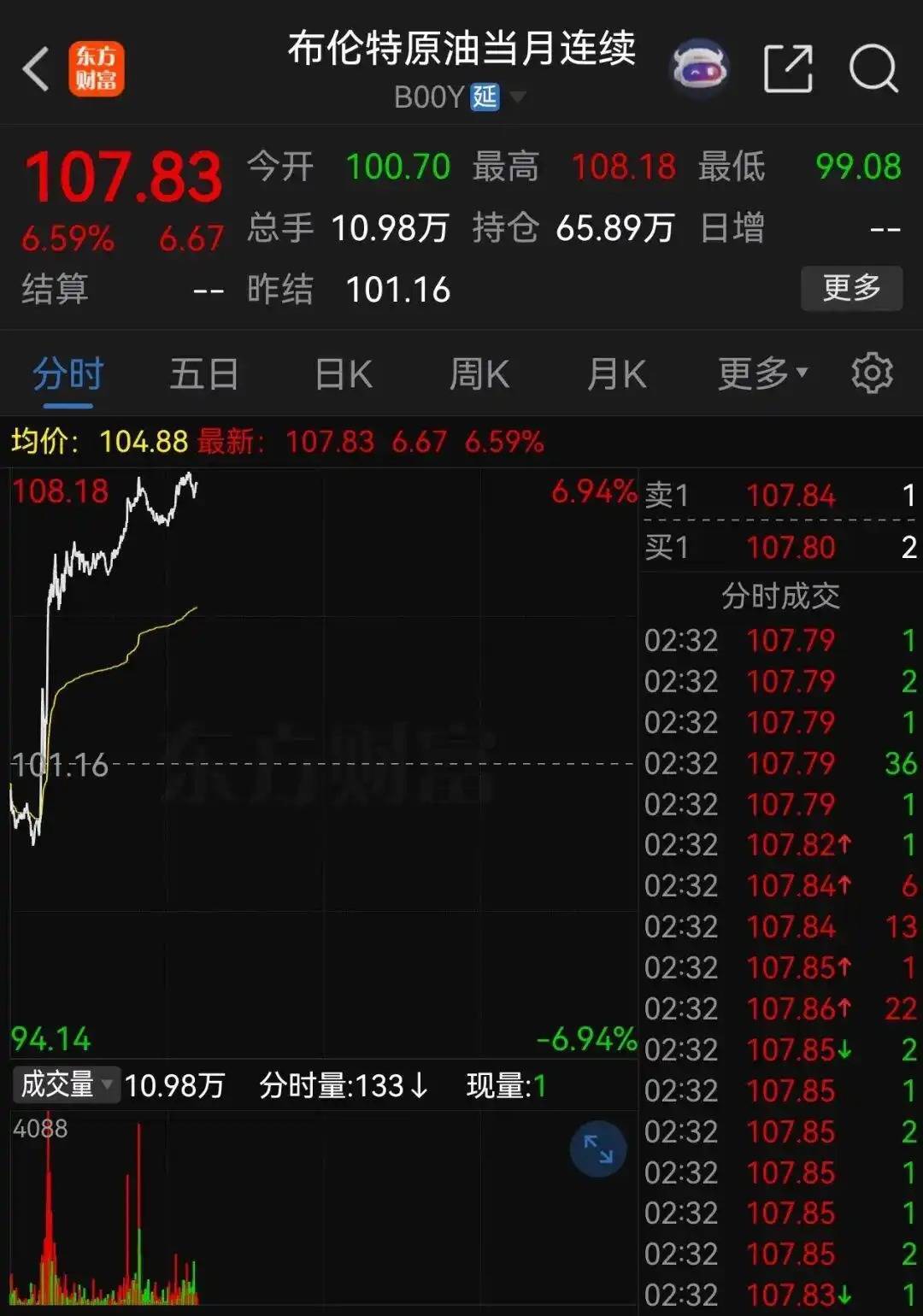 今日午后,国际油价持续大涨。布伦特原油期货涨幅扩大至7%,站上108美元/桶;WTI原油日内涨幅达6.5%,报106.66美元/桶。